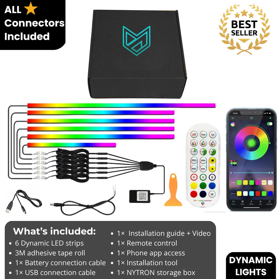 Full app control lets you change colors, brightness, and music sync effects from your phone. All light strips connect to a adapter, No extra tools needed - plug in, stick on, and ride.